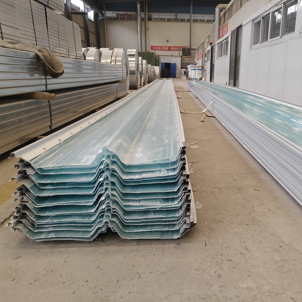 加金屬鋼邊鎖扣FRP透明采光瓦,透光性好,耐候性強,耐腐蝕。